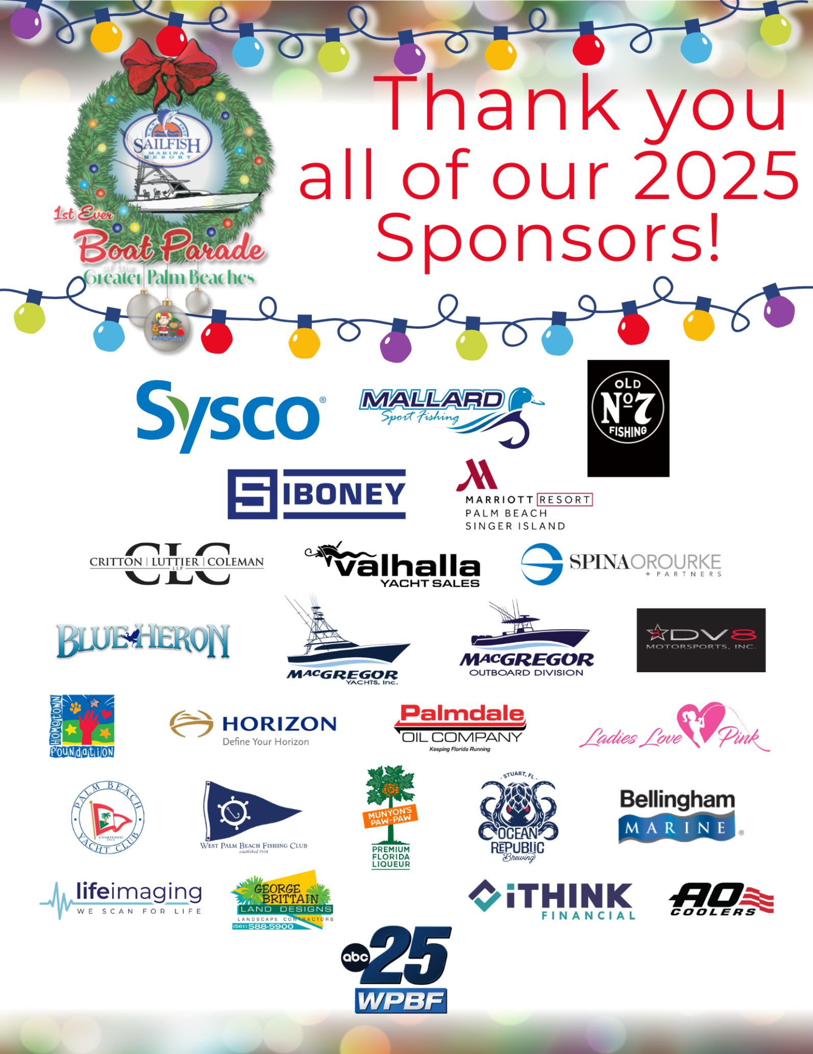 Sailfish Marina proudly presents the first ever Boat Parade of the Greater Palm Beaches – a holiday celebration along the Intracoastal Waterway from Sailfish Marina. The parade will begin at 6pm traveling south and turning around at Rybovich North. It will then travel north along the Intracoastal Waterway where it can be viewed from Riviera Beach, Lake Park and North Palm Beach. The parade will end at the North Palm US intercoastal cut. The event will be taking place on Saturday, December 13, 2025.